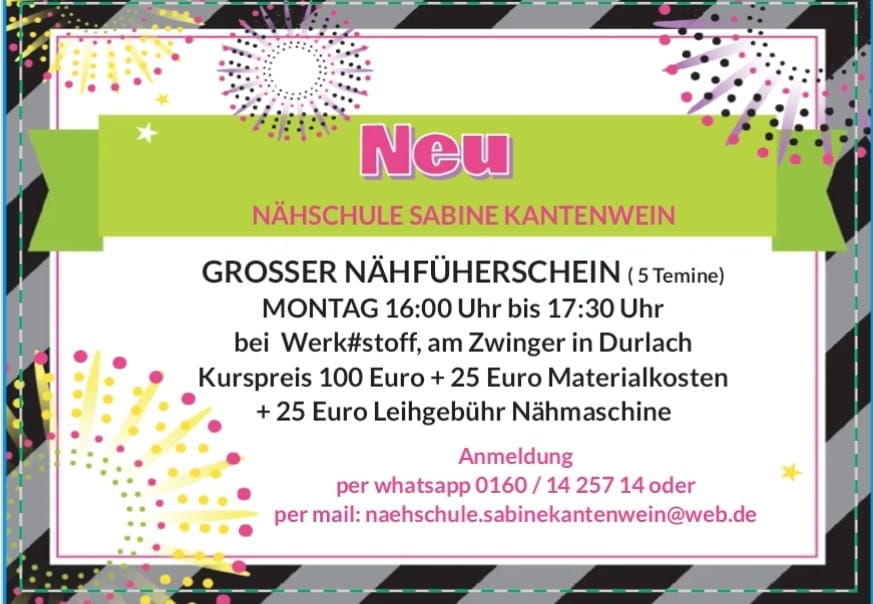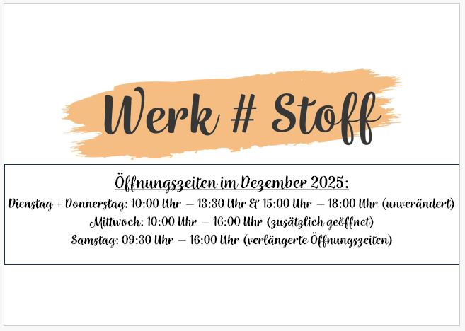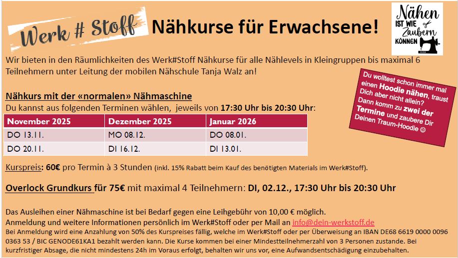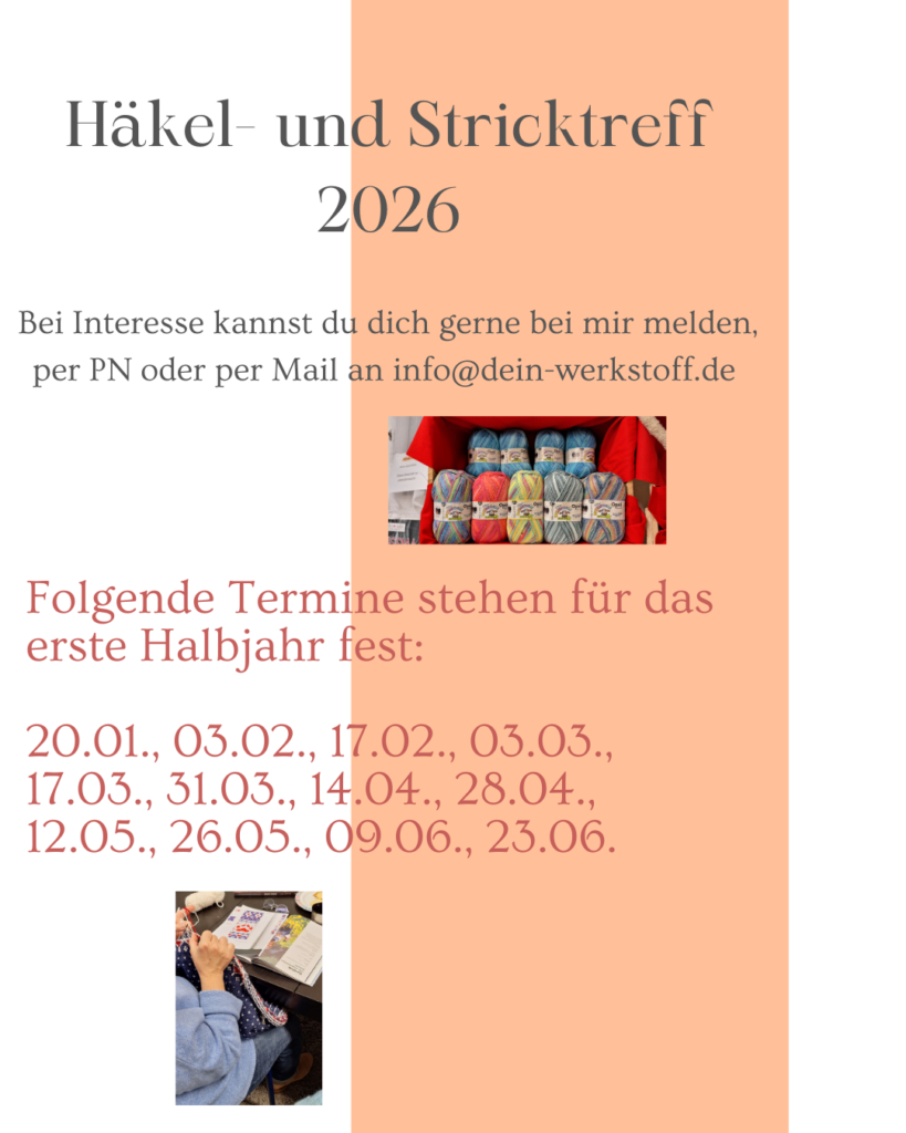 Bei Rückfragen, Interesse oder dem konkreten Wunsch nach Anmeldung schreib mir gern eine Mail an info@dein-werkstoff.de oder komm direkt bei uns im Geschäft vorbei 🙂 Wir freuen uns auf Dich!