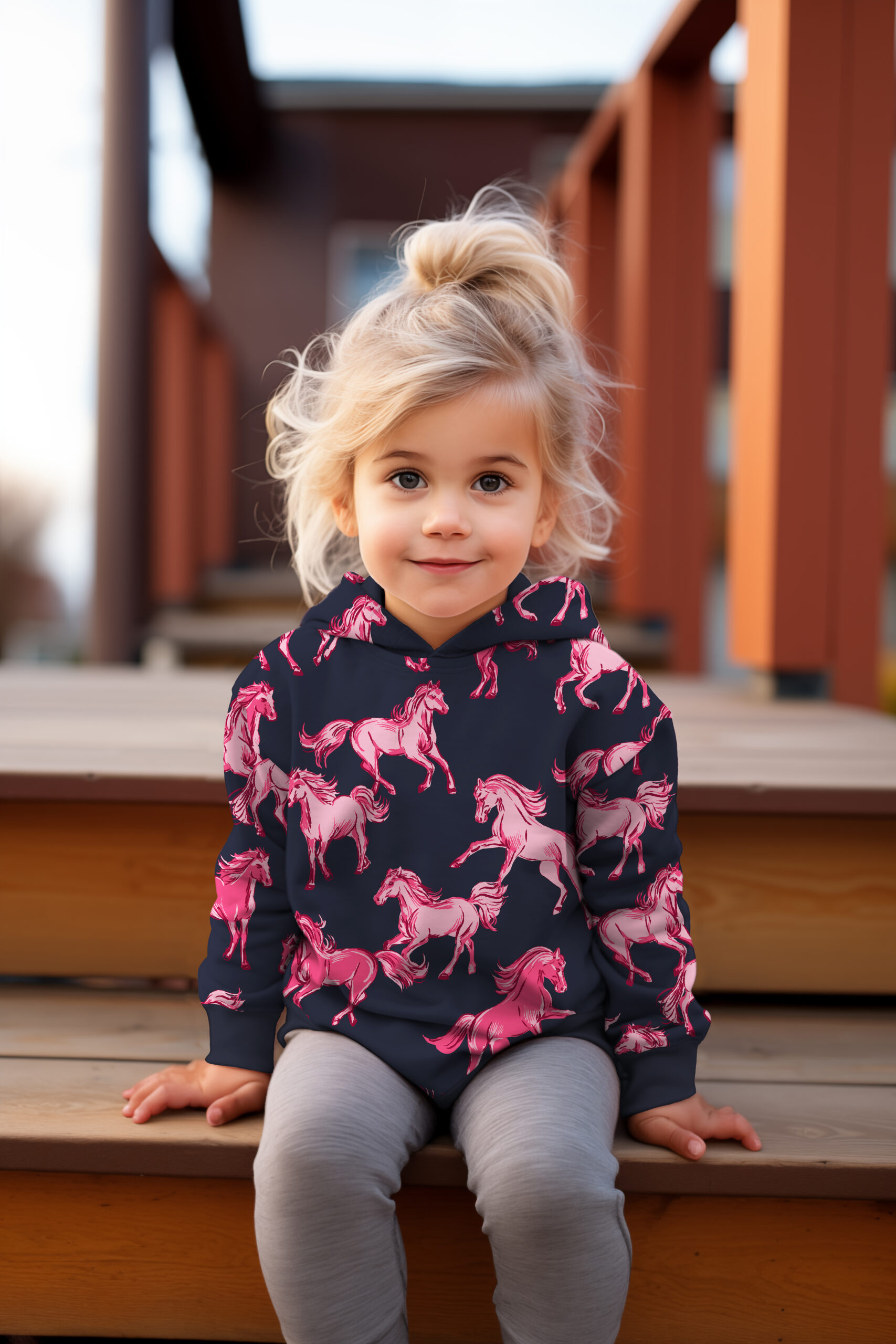French Terry marineblau mit Pferden in Rosa (Digitaldruck)